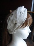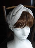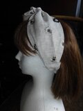 リネンにモノトーンに糸で太陽のような柄が刺繍されたオシャレな生地のクロスヘアバンドです。