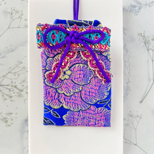 光沢のあるブルーにピンクの芍薬の花が映えるオリエンタルな雰囲気のお守り袋が登場しました!