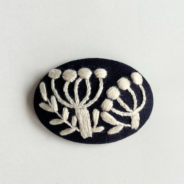 黒に近い濃紺(ネイビー)のコットン地に小さな草花を丁寧に刺繍致しました。素朴で大人可愛い北欧風のデザインです。