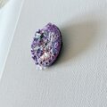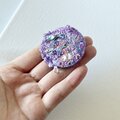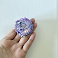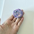 2枚のピンク色スパンコールと、透明感のある天然石ブルーとパープルビーズをふたつアクセントにつけました。アクセントには、すりガラスのような色合いの雫型ビーズをつけました。