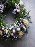 黄金ヒバ・ブルーアイス・コノテガシワ・ラナンキュラス「雪てまり」「紅てまり」・クリスマスローズ・デルフィニウム(3種)・スターチス(5種)・HBスターチス(2種)・ブルーファンタジア・ラグラス・センニチコウ・カスミソウ・ヤマシダ