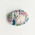 サーモンピンクの地に黒い花の刺繍、ありそうでなかったこの色のとりあわせ、すてきなブローチでした。