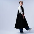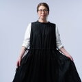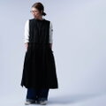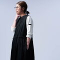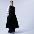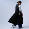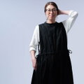 着る人の体型を選ばないエプロンワンピース。着丈はくるぶし3分の2くらい。インナーが見えるので重ね着が必要ですが、普段のTシャツにパンツスタイルに1枚プラスすればおしゃれなコーデに仕上がるエプロンワンピ。スタンドカラーも余裕があるので夏でもおしゃれな重ね着コーデ楽しめます。
