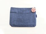 ブルーグレー色綿リネン地に可愛いピンクと赤のコスモスの花々をモチーフにしています。