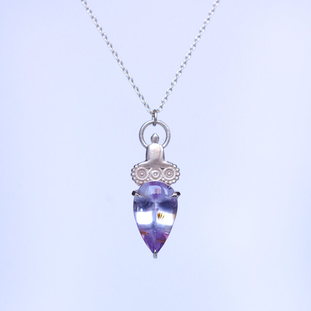 パープルとクリアがグラデーションになっているアメジストにバフカットが施され、表面からはインクルージョンの面白さが楽しめ、奥のカットが光を反射して内光りしていて魅力のつまったひとつぶ。