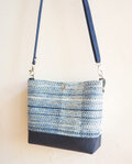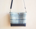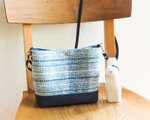 初夏から夏向けの色合いの糸を混ぜ合わせたツイード調手織り布と丈夫な倉敷帆布で、シンプルなポシェットを作りました。