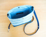 底部はスモーキーブルーの8号帆布、水色の水玉柄生地を使用。