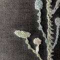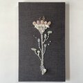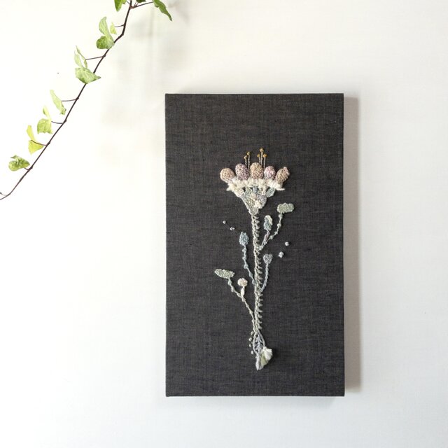 羊毛から手紡ぎした糸を墨色のリネン地に刺繍し、ファブリックパネルにいたしました。