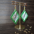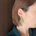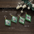 絹糸の直線的な模様とひし型が特徴的な、グリーン×白の絹糸イヤリング。