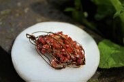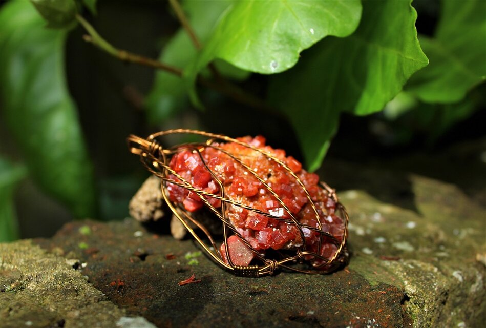 非常にゴージャスな、モロッコ産のAグレードバナジナイトのクラスターを、アンティークゴールドのワイヤーで巻きました。ファセットが施された宝石のようなクラスターは、鮮やかなオレンジ色で、小さくキラキラと輝く結晶に囲まれています。大きめのクラスターの一部にも輝くクォーツ ドゥルージーが見られ、裏面にもキラキラと輝く結晶が現れています。
