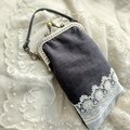 黒リネンにアンティークレースをのせたがま口タイプのスマホポーチです。
