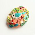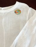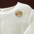 サーモンピンクの地に黒い花の刺繍、ありそうでなかったこの色のとりあわせ、すてきなブローチでした。