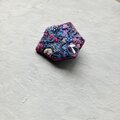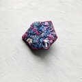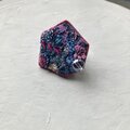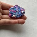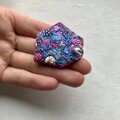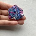 こちらは正確には六角形の刺繍ブローチになります。ビビットカラーにはピンク、濃さのあるブルーを使った夏をイメージし製作しました抽象的な一点物デザインブローチです。刺繍糸は、艶のある糸をところどころ使いデザインしています。アクセントには、シャボン玉のような透明感とつるんとした輝きを持つパールラスターガラスビーズを一粒つけました。
