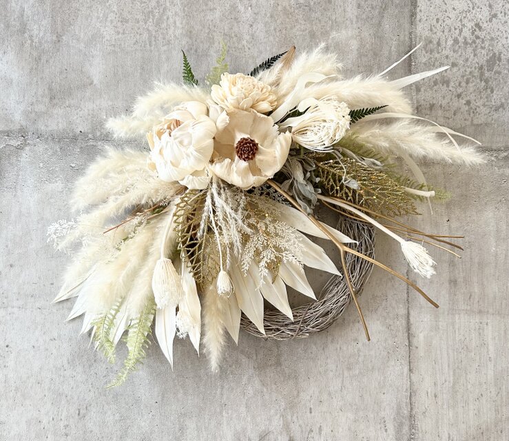 優しい色合いでドライフラワーパームフラワーやソーラーピオニーのオシャレなリース