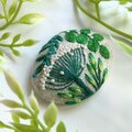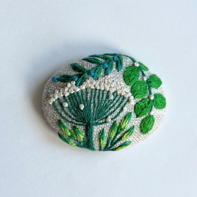 これからの季節、麻やコットンのブラウス、ワンピースや、お帽子のワンポイントなどにもいかがでしょうか。カジュアルなTシャツにもよく合います。