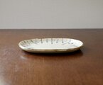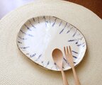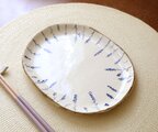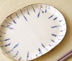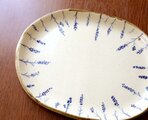 楕円形のお皿の形に成形し、ぐるりと一周ラベンダーの模様を呉須で描き、アクセントとして口元に飴色の下絵の具でラインを施しました。