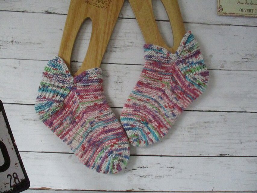 足部分はと段染めの2色でJogless stripeというストライプの技法で編み足にフィットするようにマチを入れでます。