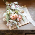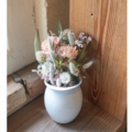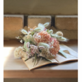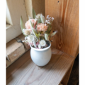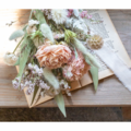 ふんわり淡いピンク色の芍薬の花2本を贅沢にメインにして、ラムズイヤーやステルンクーゲルや八重咲きの花、ハイブリッドスターチス、つぶつぶ可愛い雲龍を組み合わせて作ったスワッグです。
