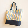 麻糸を織り込んだナチュラルトーンのボーダー柄手織り布と丈夫な倉敷帆布のコンビネーションで、スクエア型トートバッグを作りました。