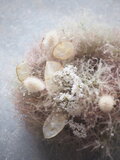 瀬戸内で育った ふわふわのスモークツリーを立体的に紡ぎ、きらりと光るルナリアや 白くて可憐な小花を添えて、コロンとして可愛らしいミニリースに仕立てました。