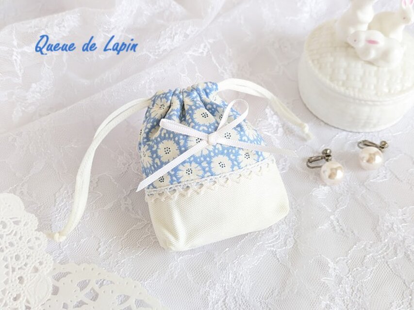 爽やかな水色地に白の花柄生地と 白の生地を合わせて作りました。