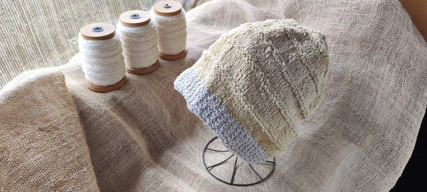 色と染色:クリームイエローは背高泡立草、ライトグレー色はハーブの草木染め