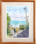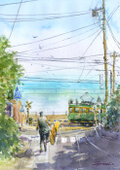 水彩画原画 湘南の海・サーファーと江ノ電 #610