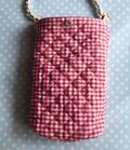 赤地のカーネーション柄のポーチです。内側は赤のギンガムチェックのキルティングで入り口にはマグネットボタンがついています。