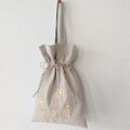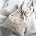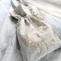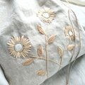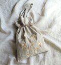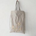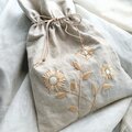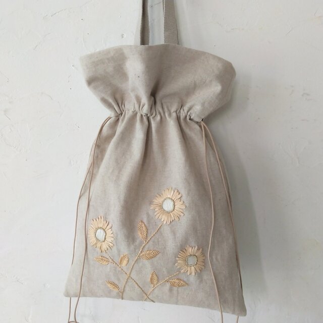ナチュラルなコットンリネンにベージュ系の刺しゅう糸、エコアンダリア、で花を刺しゅうした巾着バッグです。