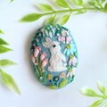 ブルーのリネン地にネザーランドドワーフの子ウサギと小さな草花を彩りよく丁寧に刺繍しました。