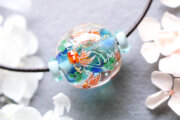 水色×青の地に泡を入れ、金魚を泳がせました。