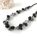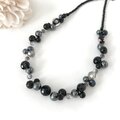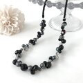煌めくカットガラスや天然石、チェコガラスを取り入れながらブラックとグレーのグラデーションをつけて編み込んでいます。
