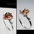 おちついたブラウンの中に独特の色彩を持つサンストーンを、唐草と透かし模様の細身のリングにセットしました。