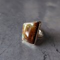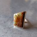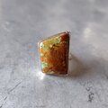 滲むような茶色のグラデーションのなかにチラリと覗くブルーグリーンが美しいターコイズをシルバーリングに仕立てました。