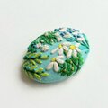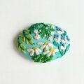 サーモンピンクの地に黒い花の刺繍、ありそうでなかったこの色のとりあわせ、すてきなブローチでした。