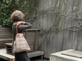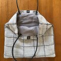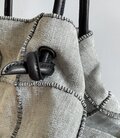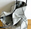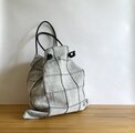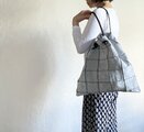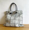 ポケットは2つ。持ち手は張りのある牛革を手縫いで仕上げました。マチは特に縫っていませんが、グリット状の凹凸があり、荷物を入れるとマチのような形状が現れる不思議な生地です。柔らかで、とても軽い(約400g)バッグです。