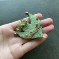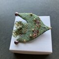 草木染め糸を使った鳥の刺繍ブローチ "soyokaze green and brown"