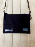片面は手織り布を全面に、もう片面は紺色の11号帆布に、手織り布のミニミニポケットとハギレがアクセントになっています。