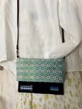 グリーンの濃淡のリネン糸でモンクスベルト(修道院のベルト)という模様を織り込んだ手織り布のサコッシュです。グリーンのグラデーションが爽やかな印象。
