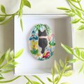 サーモンピンクの地に黒い花の刺繍、ありそうでなかったこの色のとりあわせ、すてきなブローチでした。
