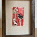 額は壁掛けにも、自立もします。カルトナージュした布を背景にしました。額の大きさ19・6×14・6cm、陶板の大きさ8・5×5cm