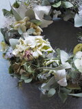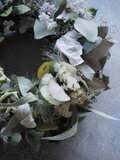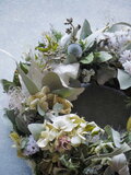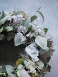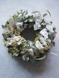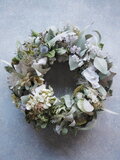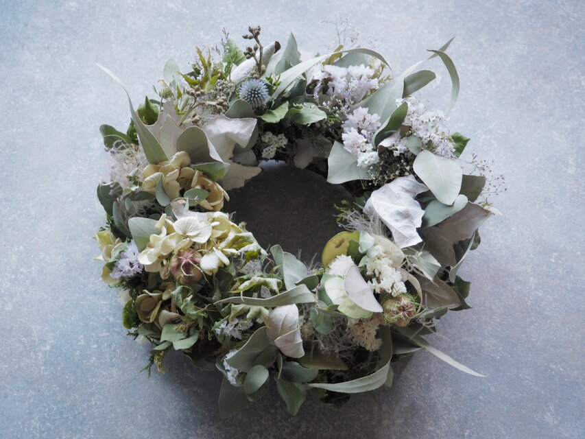 瀬戸内の森で育った 優しい緑色のユーカリを立体的に紡ぎ、おぼろげな紫陽花やホワイトポプラ はかなげなスモークツリーやブルーファンタジアを添え、消え入りそうな淡い色味の草花をたっぷりと重ねてボリューム感あるリースに仕上げました。