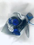プリザーブドフラワーの青い薔薇とシルバーローズ、かすみ草をあわせた花束です。深く綺麗な青薔薇にメタリックなシルバーローズのくみあわせが美しくスタイリッシュなイメージです。