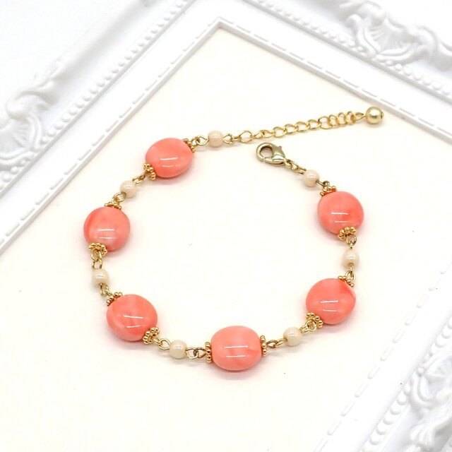 マーブル模様の入ったコーラルカラーのドイツビーズの存在感のあるブレスレットです。
