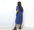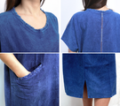 肌さわりが良く柔らかな型押しコットンを天然染料で染めたシンプルで可愛いワンピースです。襟元のフリンジやポケットと背中側のポイント手挿し刺繡がとてもキュートです。