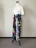 筒の全周が178cm、総丈が93cm、紐の長さ220cmです。5枚をはぎ合わせています。はぎの部分は伏せ縫いなのでアイロンの時に引っかからないです。紐は一部をミシン留めしてあり、スカートがずれないようにベルト通しを2箇所つけました。