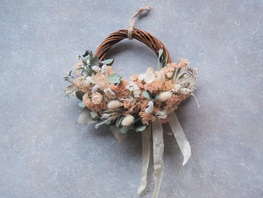 瀬戸内で育った 優しい色味のスターチスを立体的に重ね、穏やかで可憐な色味の小花を散りばめて、ヒノキの板を薄く削ったものを流し、ナチュラルで優しい雰囲気のハーフリースに仕上げました。