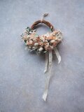 ドライフラワーなのですが、色彩に富んでいて、オレンジ色の木の実や、ブラウンのお花や松ぼっくりが、秋を感じさせてくれます。また、箱を開けた時の、ユーカリの葉のとても良い香りも、嬉しかったです。今回も、素敵なリース、ありがとうございました。
