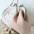 優しい雰囲気のパウダーベージュのツイルにアンティークギュピールレースをのせたがま口バッグです。