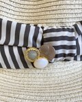 またリボンはポリエステルのつるっとしたスカーフみたいな素材のストライプ柄でモカとオフホワイトの可愛い色合い。またアンティーク調のボタンがオシャレに付いています。他にはないカジュアルで上品な大人のオシャレハットです。